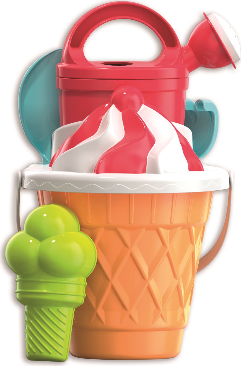 sada obsahuje: kyblík ve tvaru kornoutu o výšce 17cm, lopatku hrabičky, konvičku, bábovku ve tvaru zmrzliny a polevy a sítko