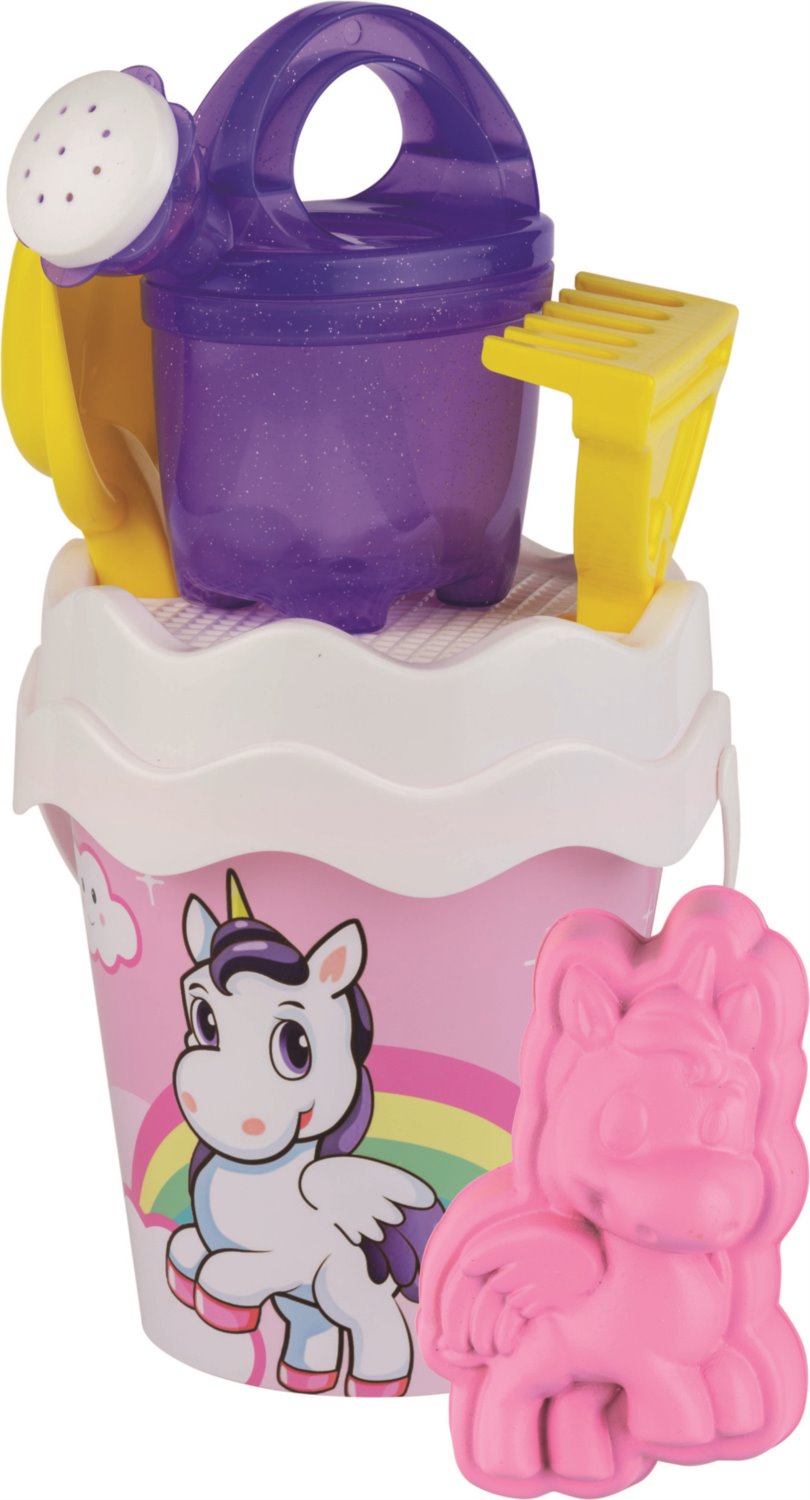 Plastová sada na písek s motivem duhového jednorožce zabaví děti na písčité pláži i v parku na pískovišti.
