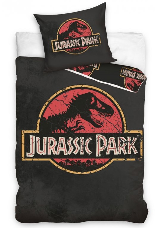 Na černé lícní straně povlaku přikrývky je veliké logo s kostrou Tyrannosaura a nápis Jurassic Park