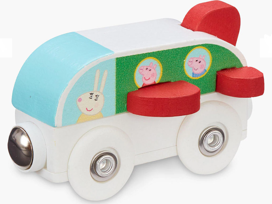 Dřevěná hračka inspirovaná oblíbeným animovaným seriálem Prasátko Peppa. Letadlo je ideální i pro menší děti, které ho snadno uchopí do ruky. Kolečka letadélka jsou rotační, děti s ním tedy mohou jezdit po podlaze nebo třeba po stole. Hračka je ze přední i zadní strany opatřena magnety, díky kterým je možné spojit více vozidel dohromady. Vyrobeno z ekologicky šetrného dřeva FSC. Prvotřídní kvalita, odolné a udržitelné dřevo s příjemnými barevnými vzory.