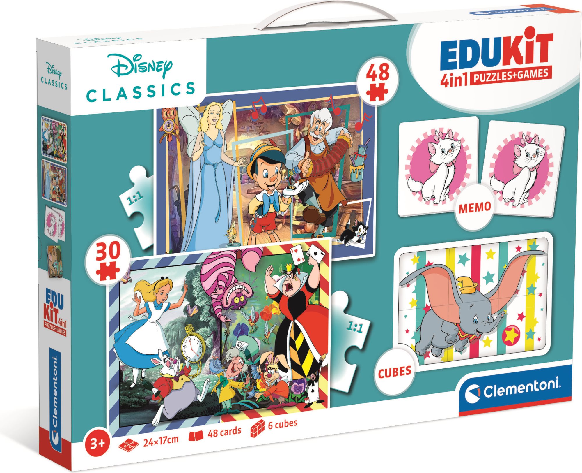 EDUkit 4v1 - soubor her (puzzle 30 dílků, puzzle 48 dílků, 6 plastových kostek a pexeso). Puzzle je o stejném rozměru 24 x 17 cm, ale s různým počtem dílků, proto se s vyšším počtem dílků zmenšuje jejich velikost. Baleno v kartonové krabici s plastovým uchem pro snadné přenášení.