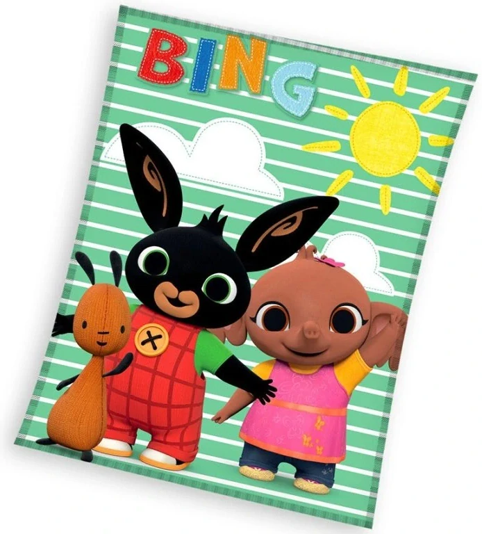 Podklad deky je zelené barvy s tenkými bílými proužky a vzor doplňují mráčky, sluníčko a velký nápis Bing