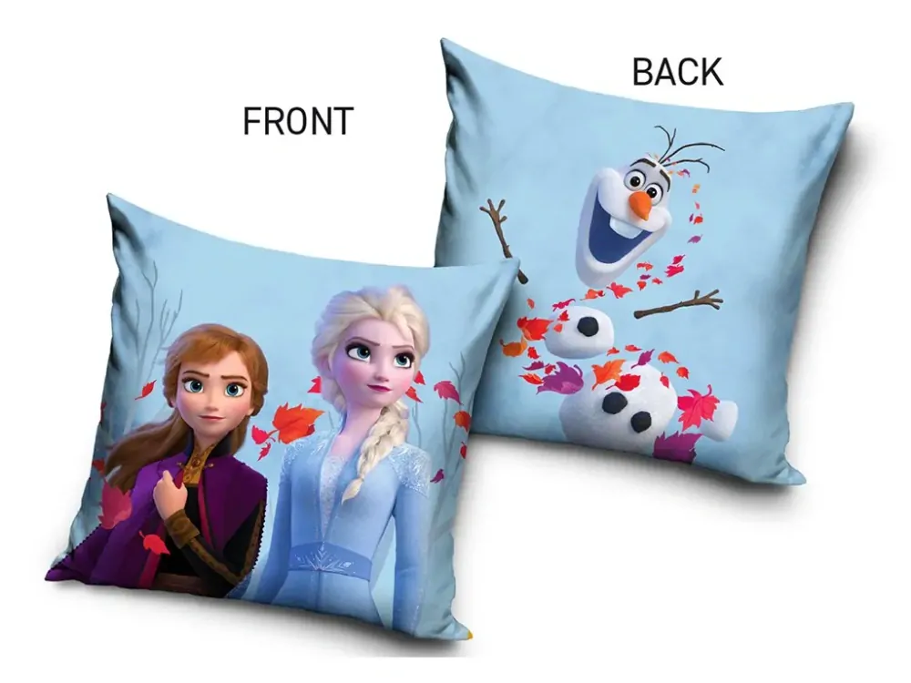 Na modrém polštářku jsou z obou stran postavy z oblíbené pohádky Ledové Království