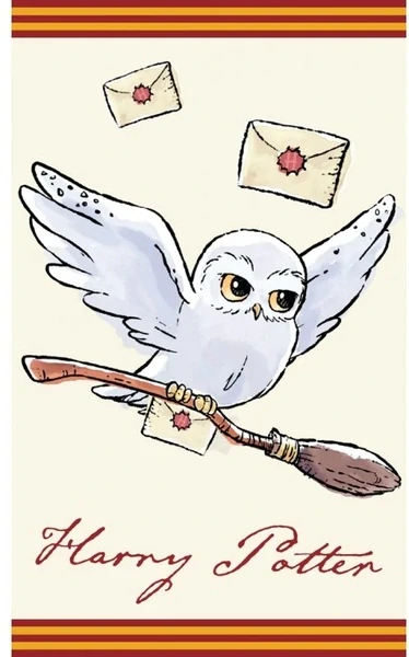 Na lícní straně ručníčku letí sova Hedvika, která nese koště a dopis