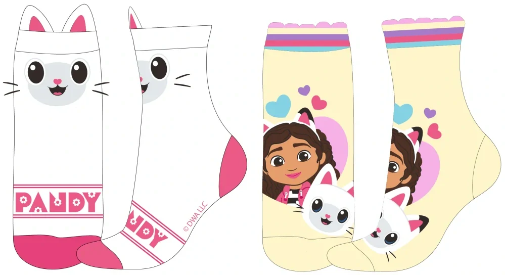Dívčí ponožky v designu Gabby´s Dollhouse, sada 2 ks párů, 1 pár žluté s barevným potiskem, materiál: 58% bavlna + 26% polyester + 13% polyamid + 3% elastan a 1 pár bílé v kombinaci s růžovou a s barevným potiskem, materiál: 68% bavlna + 23% polyester + 5% polyamid + 3% elastan. Ponožky perfektně přiléhají k noze, nestlačují a zároveň perfektně drží na noze a zajišťují vysoký komfort nošení. Ponožky jsou velmi pohodlné a díky použití kvalitních materiálů odolné proti praní a oděru. Měkké na dotek.