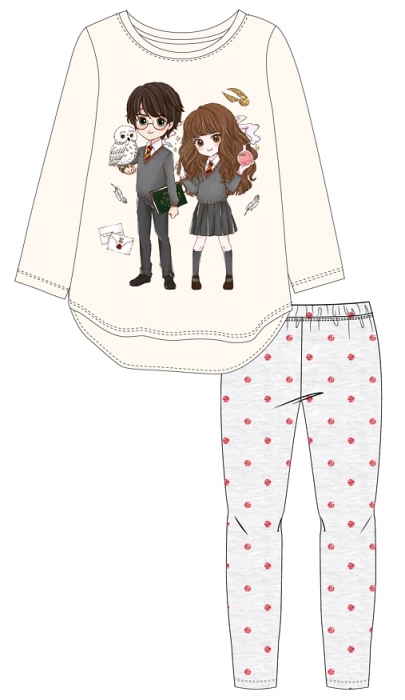 Dívčí pyžamo s dlouhým rukávem s motivem Harry Potter, barevné provedení - horní díl krémový s barevným potiskem, kalhoty světle šedé s potiskem, materiál: 100% bavlna, 160 gsm, šedá melange 98% bavlna + 2% polyester. Pyžamo je vyrobeno z vysoce kvalitní bavlny, kalhoty jsou s nekompresivním elastickým pasem, zcela volné a pohodlné na spaní.