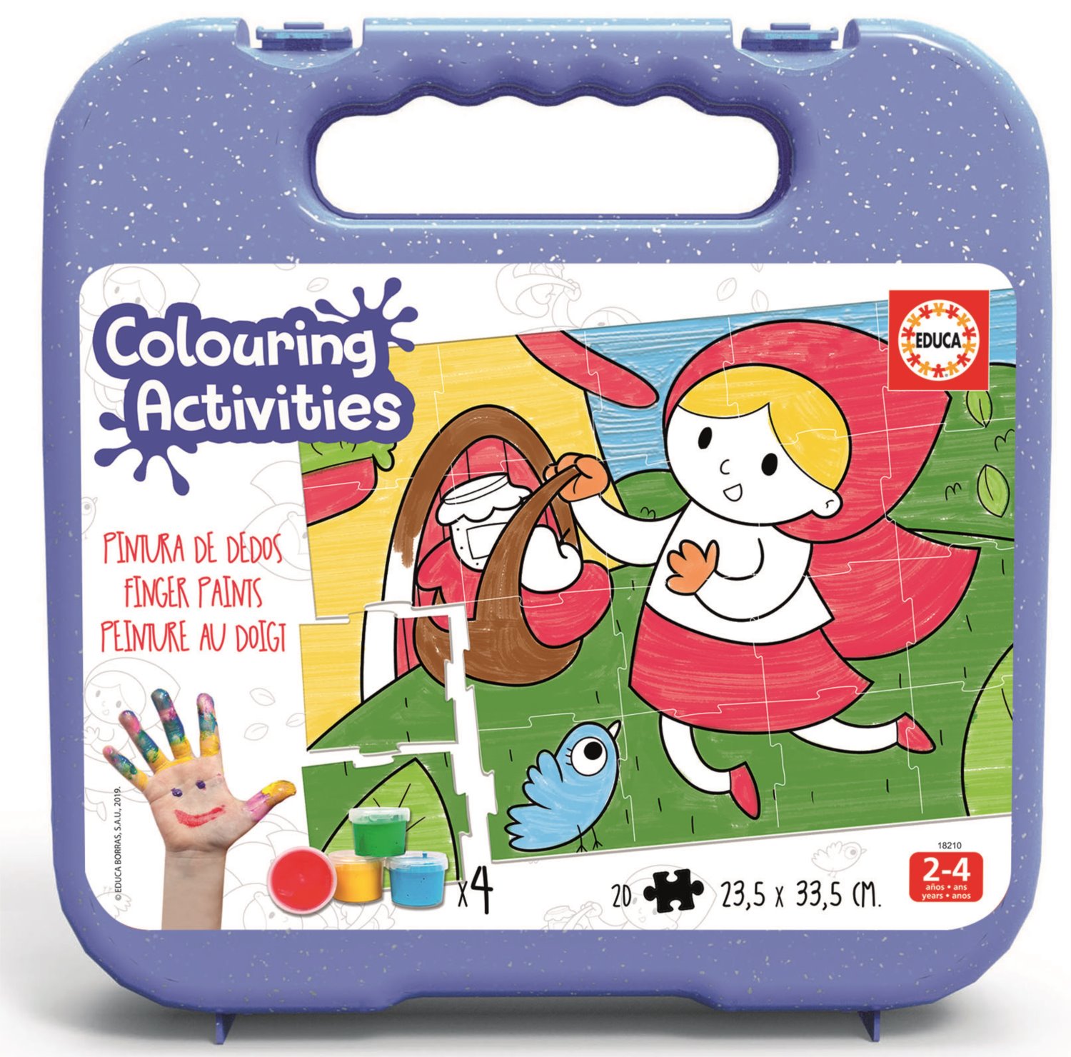 Zábava s barvičkami! Složte a poté si dle vlastní fantazie vybarvěte puzzle s veselým motivem z kolekce Colouring Activities . Balení obsahuje puzzle s 20 dílky, které jsou ze zadní strany očíslované pro snazší složení, 4 nádobky prstových barev a podložku na malování. Vhodné pro děti od 2 let.