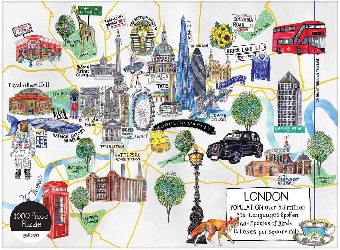 Puzzle od anglického výrobce Galison s motivem ilustrované mapy Londýna, kde najdete nejznámější londýnské památky, jako jsou například Buckinghamský palác, Trafalgarské náměstí, Royal Albert Hall a další. Puzzle obsahuje texty v anglickém jazyce.