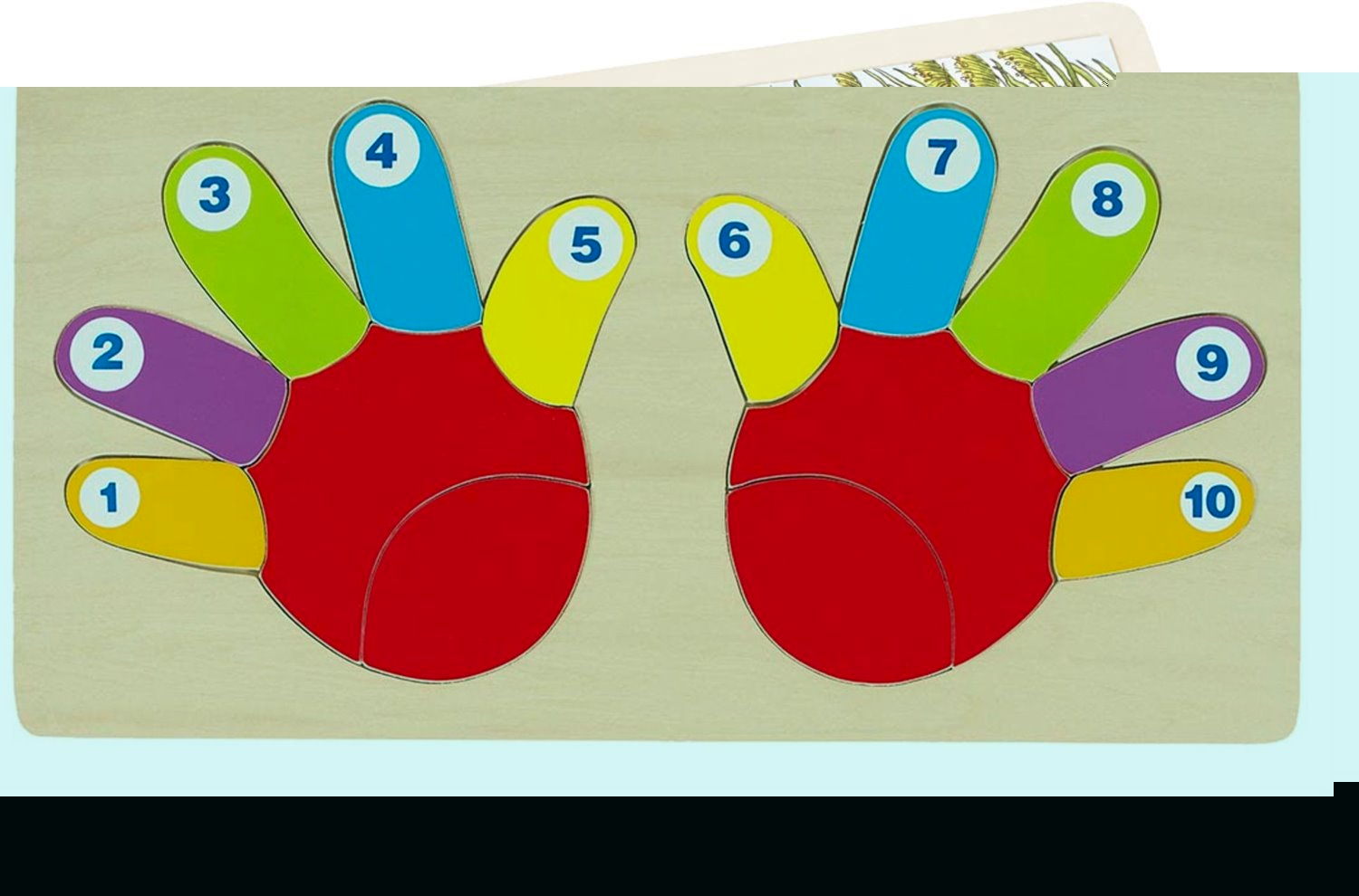 Vkládací puzzle s motivem rukou. Naučte se s vkládačkou počítat na prstech. Každá ruka obsahuje 7 dílků. Výhody: