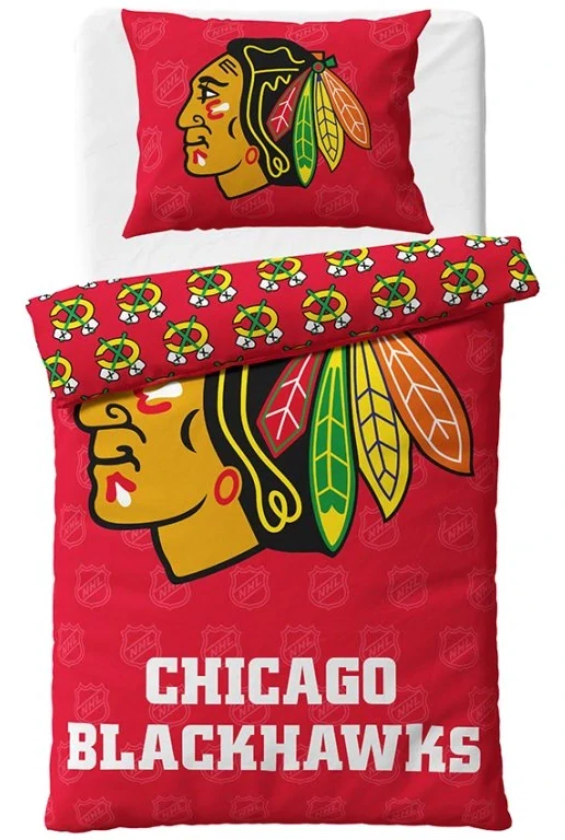 Na lícní straně povlaku přikrývky je klubový znak indiánského náčelníka Černého Jestřába doplněný o bílý nápis "Chicago Blackhawks"