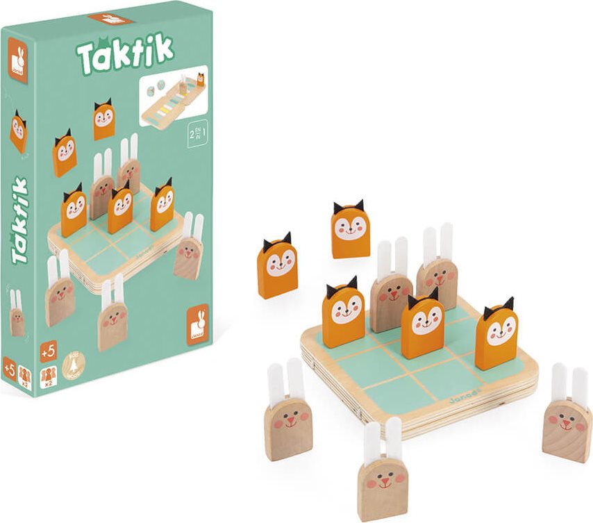 Roztomilá hra 2v1, kterou si můžete vzít kamkoli s sebou! Malí králíčci a lišky s plstěnýma ušima vám budou dělat společnost při hraní dvou různých her na jedné hrací desce! První hra: Morpion (Tic Tac Toe) - Piškvorky Hráči se střídají v umisťování figurek na hrací desku. Jako první seřaďte tři stejné figurky a vyhrajte hru, a to diagonálně, vertikálně nebo horizontálně. Druhá hra: Honička. Hráči se střídají v házení kostkou a posouvají svou figurku. Pozor, k vítězství je třeba získat přesné číslo, abyste mohli přistát na posledním políčku! V opačném případě se vraťte a začněte znovu! Pokud hráč během závodu dorazí na již obsazené políčko, zaujme místo svého soupeře, který se vrátí na start. Balení obsahuje: 1 oboustrannou hrací desku, 5 králíčků, 5 lišek a 2 kostky, návod.