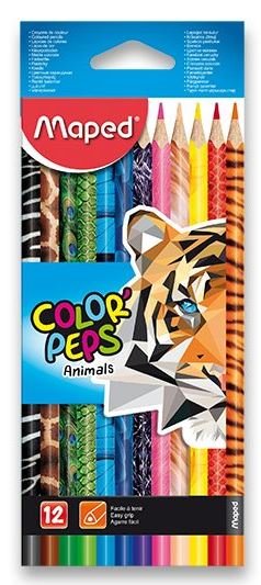 Souprava 12 kusů ergonomických pastelek MAPED Color'Peps se zvířecími motivy. Pastelky mají jasné barvy a měkkou odolnou tuhu. Trojhranný tvar usnadňuje dětem jejich držení.