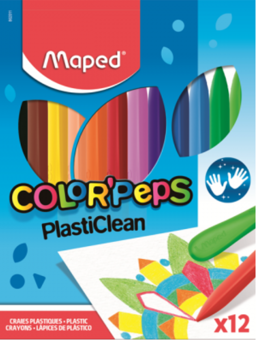 Plastové pastelky s trojhranným tělem. Jeden konec se špičkou pro přesné kreslení, druhý plochý pro vybarvování větších ploch. Nezanechávají stopy na rukou a jednoduše se ořezávají. Pastelky Color'Peps PlastiClean vydrží 3x déle než standardní voskovky.