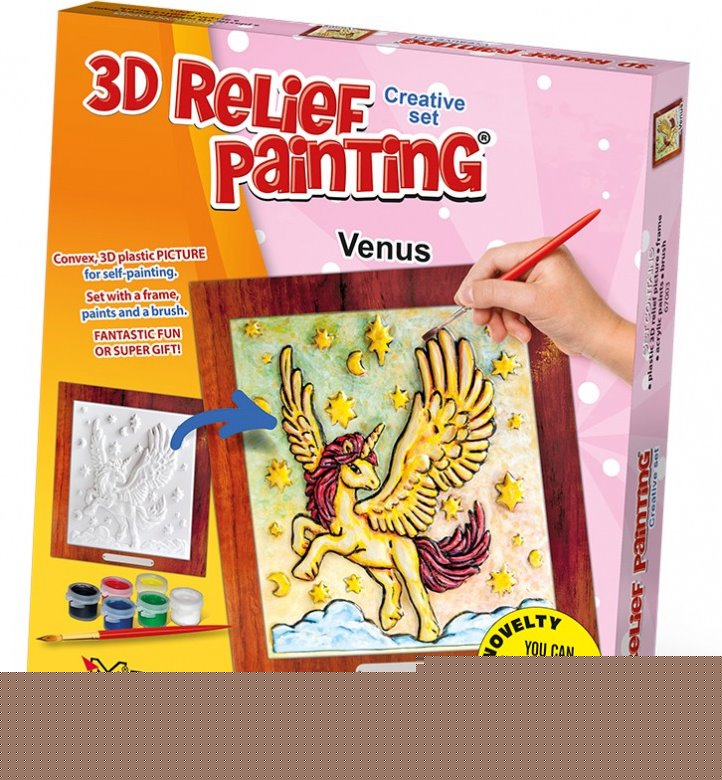 Sada obsahuje 3D plastový reliéfní obrázek 15x17 cm, papírový rámeček 19x21 cm, akrylové barvy (6 ks) a štětec.