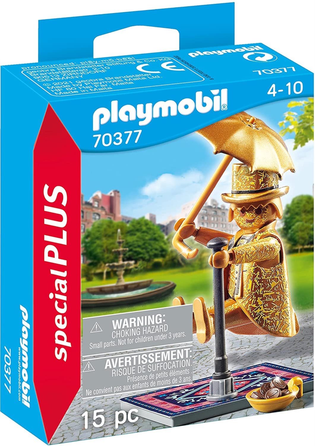 Tento umělec rád vystupuje na ulici. Svým zlatým kostýmem poutá pozornost všech kolemjdoucích . Stojí velmi nehybně a nehýbe se, dokud najednou nezamává svým zlatým slunečníkem a pozdraví publikum. Postavy PLAYMOBIL Special Plus se skvělými doplňky jsou ideální suvenýry. Skvělá zábava sbírat, hrát a rozdávat!