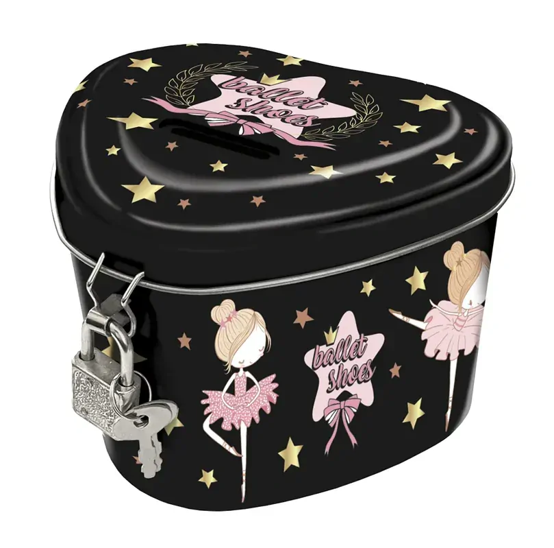 Pokladnička pro děti s motivem baletky, plechová, odolná, ve tvaru srdce s ozdobným potiskem, se zámkem a 2 klíčky. Uzamykatelné víko udrží vaše úspory každý den v bezpečí. Vhodná pro děti od 3 let.