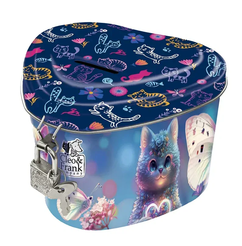 Pokladnička pro děti s motivem kočky z kolekce Cleo a Frank, plechová, odolná, ve tvaru srdce s ozdobným potiskem, se zámkem a 2 klíčky. Uzamykatelné víko udrží vaše úspory každý den v bezpečí. Vhodná pro děti od 3 let.
