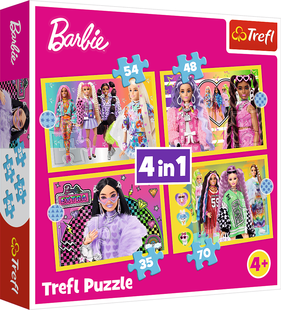 Dětské puzzle TREFL s motivem panenek Barbie. Progresivní puzzle s různou obtížností - 4 puzzle s 35 - 70 dílky.