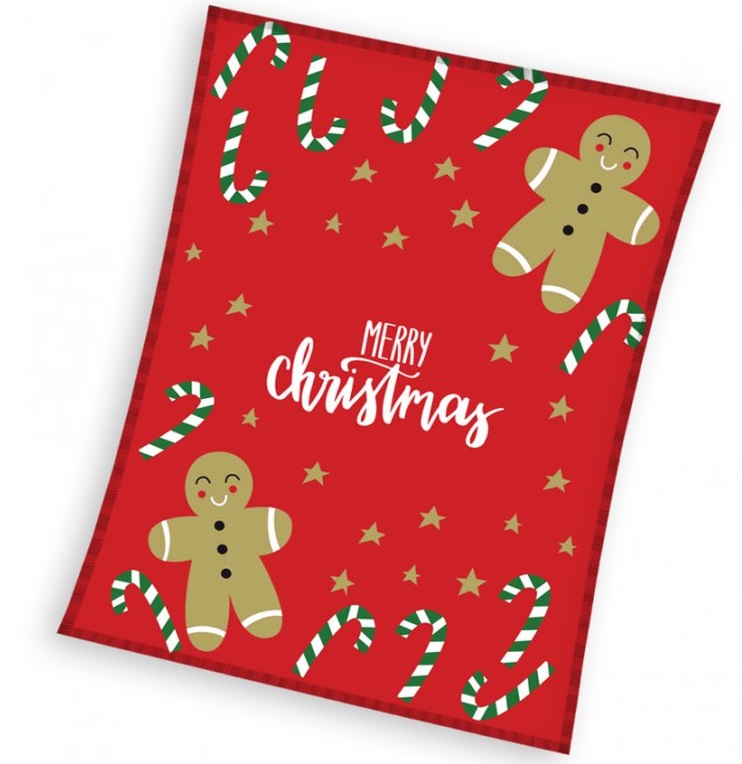 Vánoční deka Perníčci, je vyrobena z hřejivého fleecu, 100% polyesteru, s gramáží 180g/m²