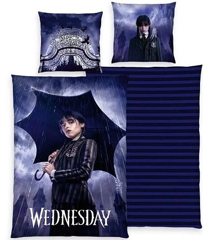 Wednesday je známá svým nezaměnitelným černým outfitem, bledou pletí a charakteristickým temným humorem – tyto prvky se odrážejí i v designu povlečení, které kombinuje tmavé a výrazné detaily s jemným kontrastem.