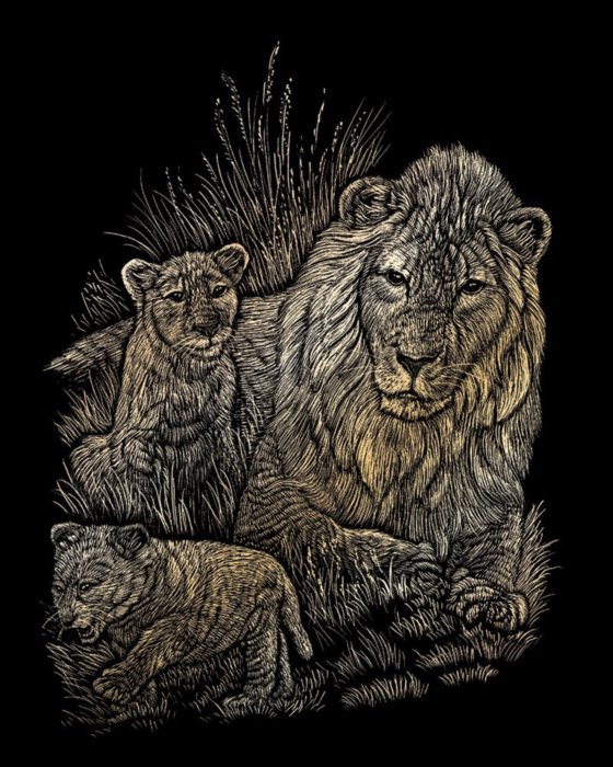 Zlatý škrabací obrázek Lvice s lvíčaty